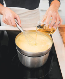 Sbattete 6 tuorli con 60 g di zucchero, poi incorporate la farina setacciandola. Portate a ebollizione il latte con una scorzetta d'arancia. Lasciatelo intiepidire, togliete la scorza e unitelo a filo alla crema mescolando. Versate in una pentola e fate addensare a fuoco dolce, mescolando continuamente con una frusta, fino al primo cenno di bollore. Fate raffreddare su acqua ghiacciata mescolando di tanto in tanto.