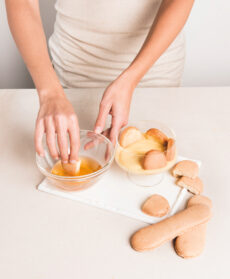 Montate la panna e incorporatela a entrambe. Versate lo zabaione sul fondo delle coppe, foderate le pareti con la punta dei savoiardi inumiditi nel Moscato rimasto. Tenete da parte 30/40 amaretti interi per decorare e sbriciolate gli altri.
