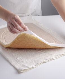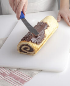 La pasta biscotto, usata in questa ricetta, è una preparazione morbida e spugnosa, simile al pan di Spagna, ma più sottile ed elastica. La cottura deve essere breve, altrimenti diventa dura e dunque difficile da arrotolare.