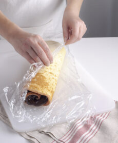 Circa 15 minuti prima di servire, estraete il tronchetto dalla pellicola e disponilo su un piatto da portata. Spalmate tutta la superficie visibile con la crema rimasta, che avrete ancora montato per 30 secondi con le fruste.