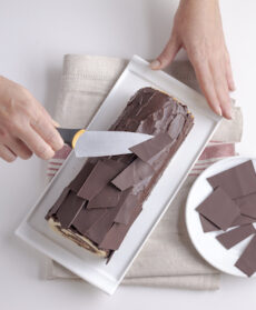 Spezzettate il cioccolato solidificato a scaglie irregolari. Sollevatele con la lama di un coltello e disponetele sul tronchetto coprendolo completamente così da simulare la corteccia. Spolverizzate a piacere con zucchero a velo e servite.