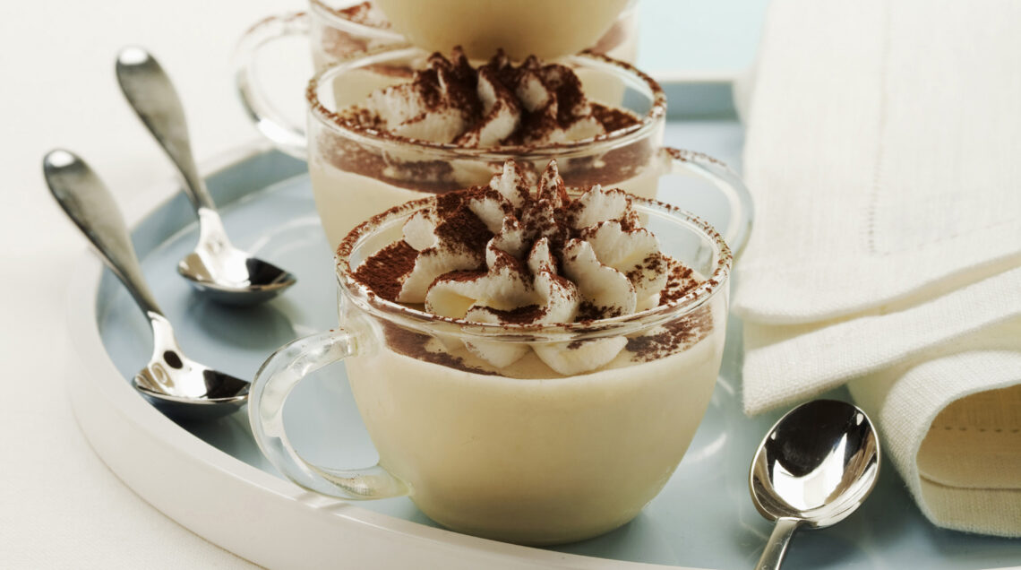 3 Prima di servire, completate ciascuna tazza con un ciuffo della panna montata rimasta e una spolverizzata di cacao.