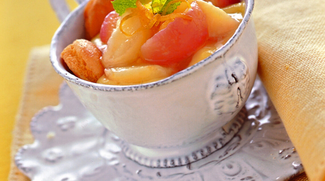 1) Spezzetta i savoiardi, bagnali nello sciroppo di cottura delle pesche e suddividili sul fondo di 4 tazze o coppe.