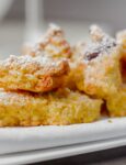 3 In una casseruola mettete abbondante olio di semi di girasole. Prendete l’impasto a cucchiate, facendo delle sfere irregolari da immergere nell’olio. Fate gonfiare e colorire da entrambe le parti le frittelle, scolate bene e asciugate su di un foglio di carta paglia tamponando con carta assorbente. Spolverizzate con abbondante zucchero a velo quando sono ancora belle calde.