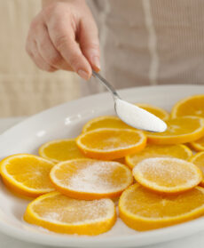 Prendi le arance, pelale a vivo e tagliale a fette di 7-8 millimetri: continua la preparazione della ricetta delle arance fritte nel vino bianco adagiando le fette in un vassoio e bagnandole con il rum. Fai attenzione a non romperle, poi spolverizzale con 30 grammi di zucchero.
