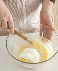 Monta a neve gli albumi con un paio di fruste elettriche, lasciandoli morbidi, e uniscili alla pastella con movimento dal basso verso l'alto.