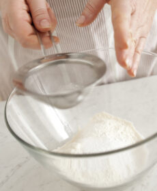 Intanto prepara la pastella che serve per la frittura del frutto. In una ciotola setaccia la farina insieme al lievito, aggiungi poi lo zucchero rimasto.