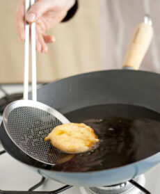 Scalda dell'olio in una padella: mentre la temperatura aumenta passa le fette di arance nella pastella una dietro l’altra. Ripeti l'operazione con tutte le fette, poi sistemale nell’olio bollente e cuocile fino ad avere un colorito ben dorato.