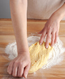 Setacciate la farina in una ciotola, fate una fossetta al centro e disponetevi le uova, un pizzico di sale, il lievito, la scorza grattugiata di 1/2 arancia e lo zucchero. Impastate unendo via via il Vin Santo. Lavorate la pasta per 10 minuti sulla spianatoia infarinata, poi fatela riposare 30 minuti sotto una ciotola capovolta.