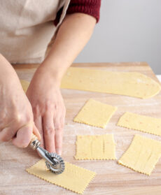 Stendetela a strisce sottili con la sfogliatrice o il mattarello e dividetele in rettangoli irregolari.