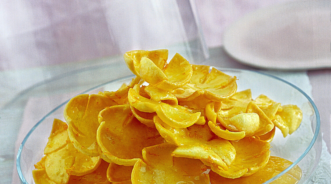 3 Scaldate sul fuoco abbondante olio di arachidi in una padella ampia. Friggetevi le chiacchiere poche per volta. Quando risultano ben dorate, scolatele con una schiumarola su carta per fritti.