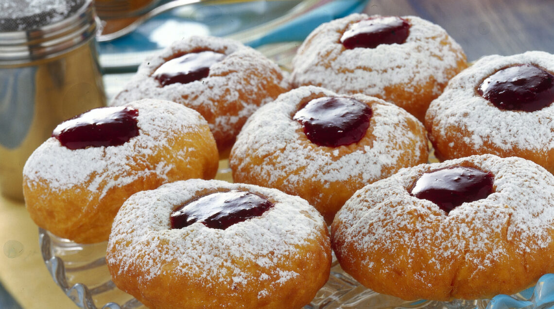 Soffici e fragranti, le frittelle sono farcite con abbondante confettura di ribes o di mirtilli. Una pioggia di zucchero a velo le rende golose per ogni momento della giornata