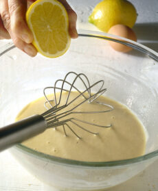 Quindi, aiutandovi con una frusta, incorporate l'uovo leggermente sbattuto e il latte, versandolo a filo, e qualche goccia di limone. Coprite la ciotola e lasciate riposare la pastella in frigorifero per un'ora circa.