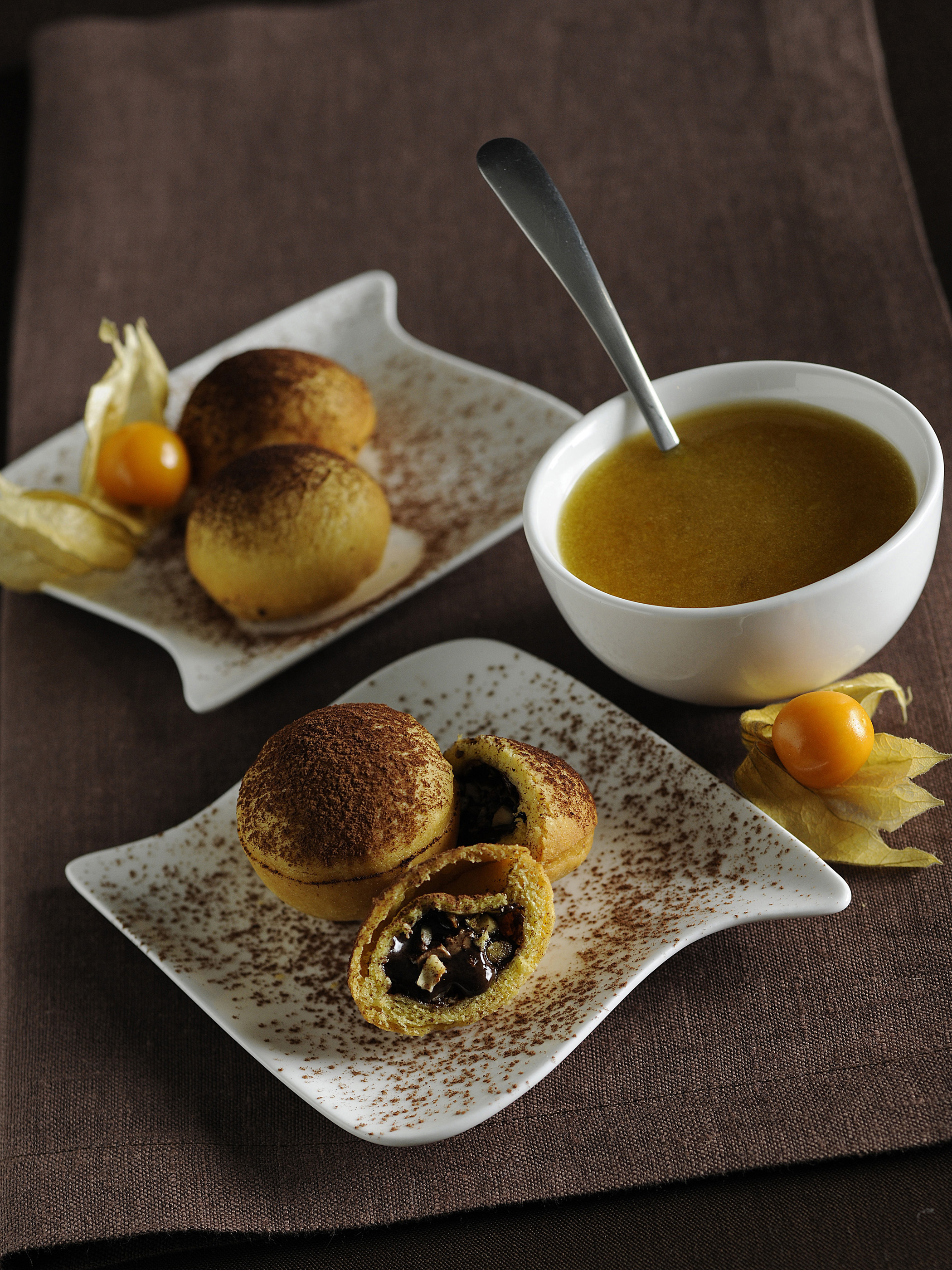 2) Scaldate l’olio fino alla temperatura giusta quindi iniziate a friggere i krapfen. Una volta cotti, scolateli e cospargeteli di cacao. Offrite ai vostri ospiti i mini krapfen al cioccolato accompagnati dalla salsa al liquore.