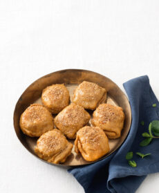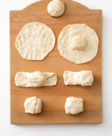Ungi le mani e appiattisci le palline di pasta fino a ridurle in larghi dischi. Poni al centro di ognuno una porzione di farcia e richiudi la pasta sul ripieno ripiegandola in 4 lembi. Ungi ancora leggermente, pressale appena con le dita e correggi la forma in modo che risulti quadrata.