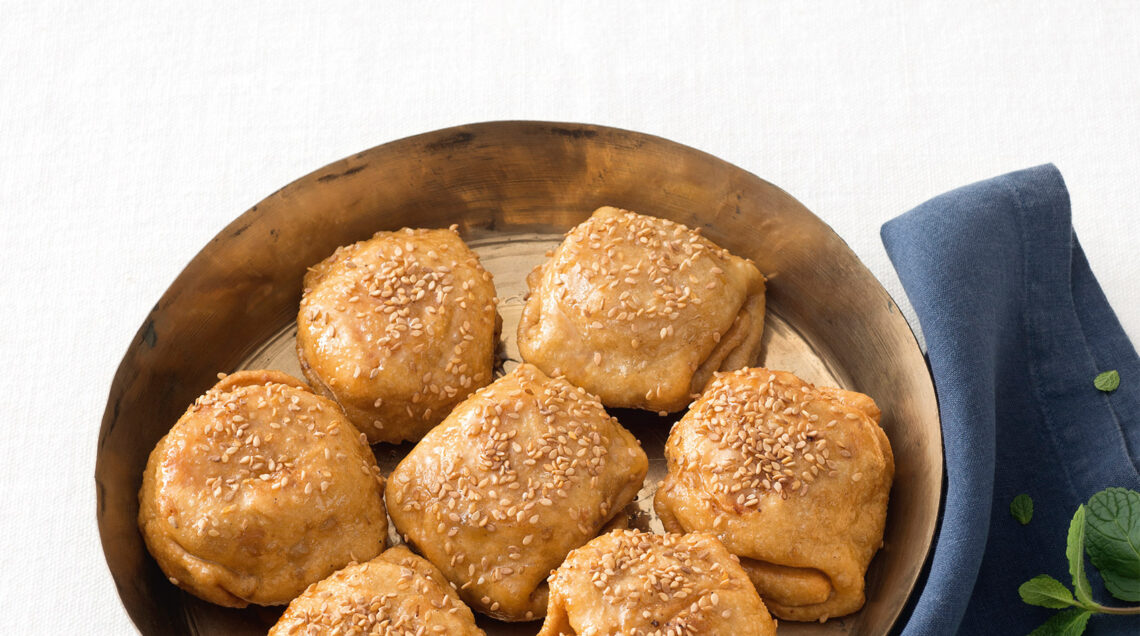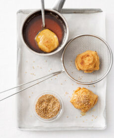 Fai sciogliere il miele in un pentolino a fuoco dolce. Friggi le frittelle da ambo i lati in abbondante olio bollente finché saranno dorate e scolale su carta da cucina. Intingile una alla volta nel miele e mettile a sgocciolate su una gratella. Cospargile con un po' di semi di sesamo.