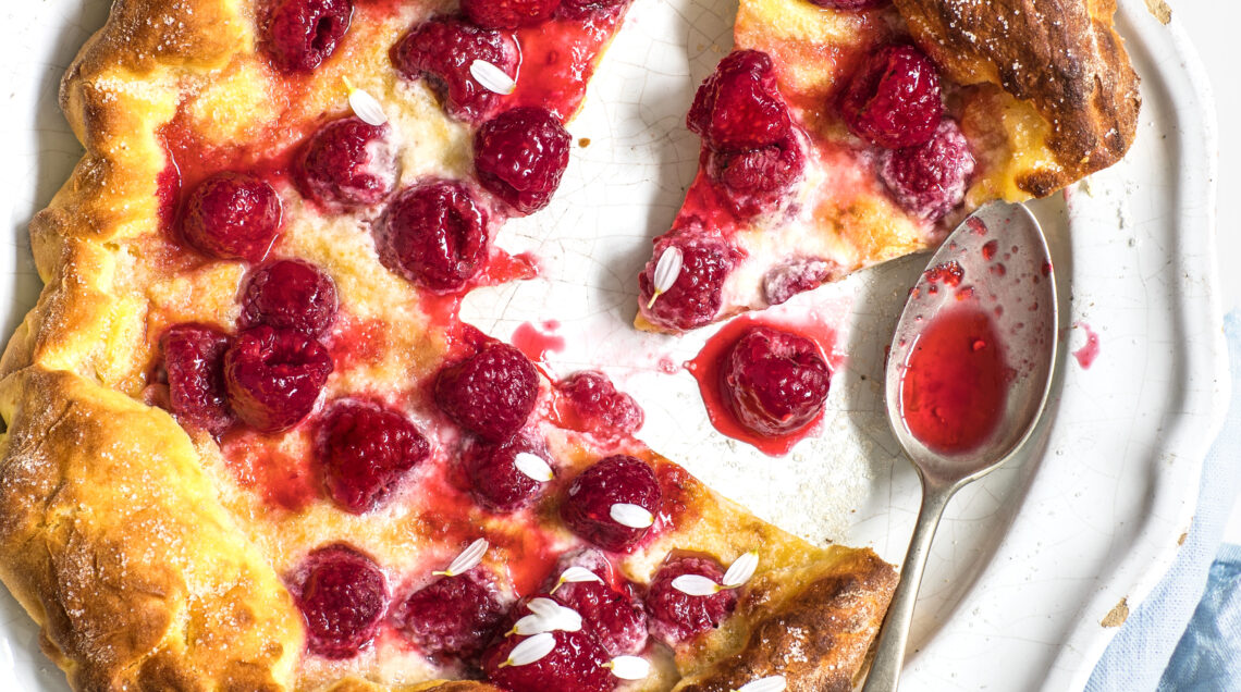 5) Montate la panna con una presa di sale, distribuitela sopra la galletta e completate con lo zucchero rimasto e metà dei lamponi. Cuocete a 220° per circa 10 minuti. Guarnite con i lamponi rimasti, lasciate raffreddare e cospargete con zucchero a velo.