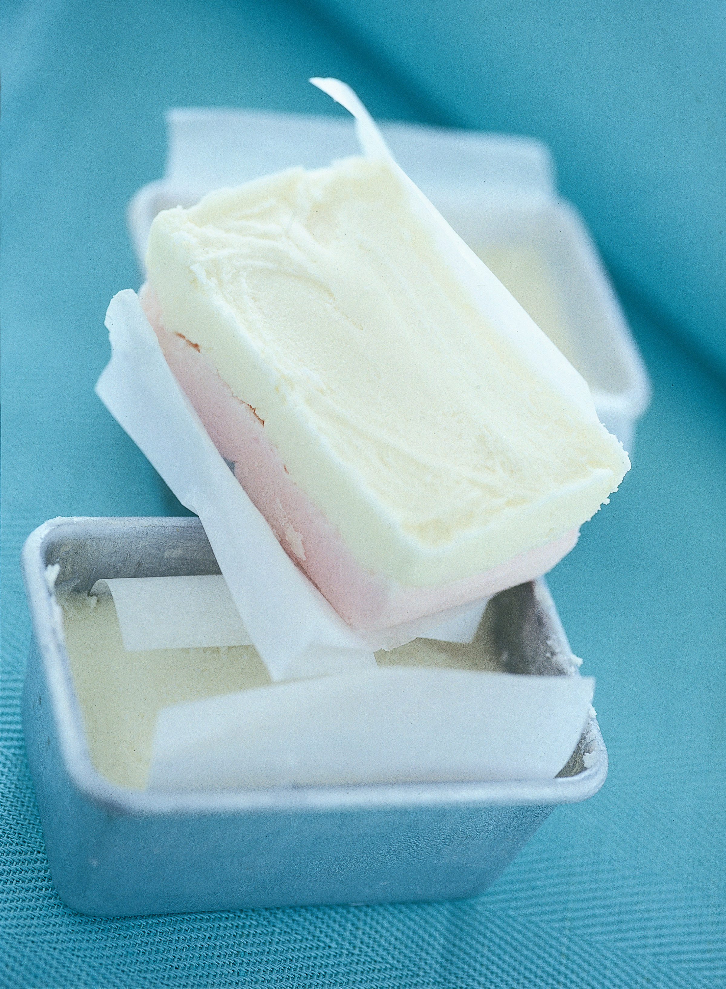5) Quando il gelato è pronto, frullane metà insieme allo zucchero e alle fragole. Prendi 8 stampini da plum cake e versaci il composto di gelato e fragole, arrivando solo a metà altezza, livellalo con una spatola e poi rimettilo nel freezer per circa un’ora. Trascorso questo tempo, estrai gli stampini e versaci il resto del gelato al miele, livella anch’esso con la spatola e rimetti nel freezer. Quando è ben sodo, sforma le barrette bicolori e servile subito. Se non hai la gelatiera, o hai poco tempo, puoi usare del gelato già pronto.