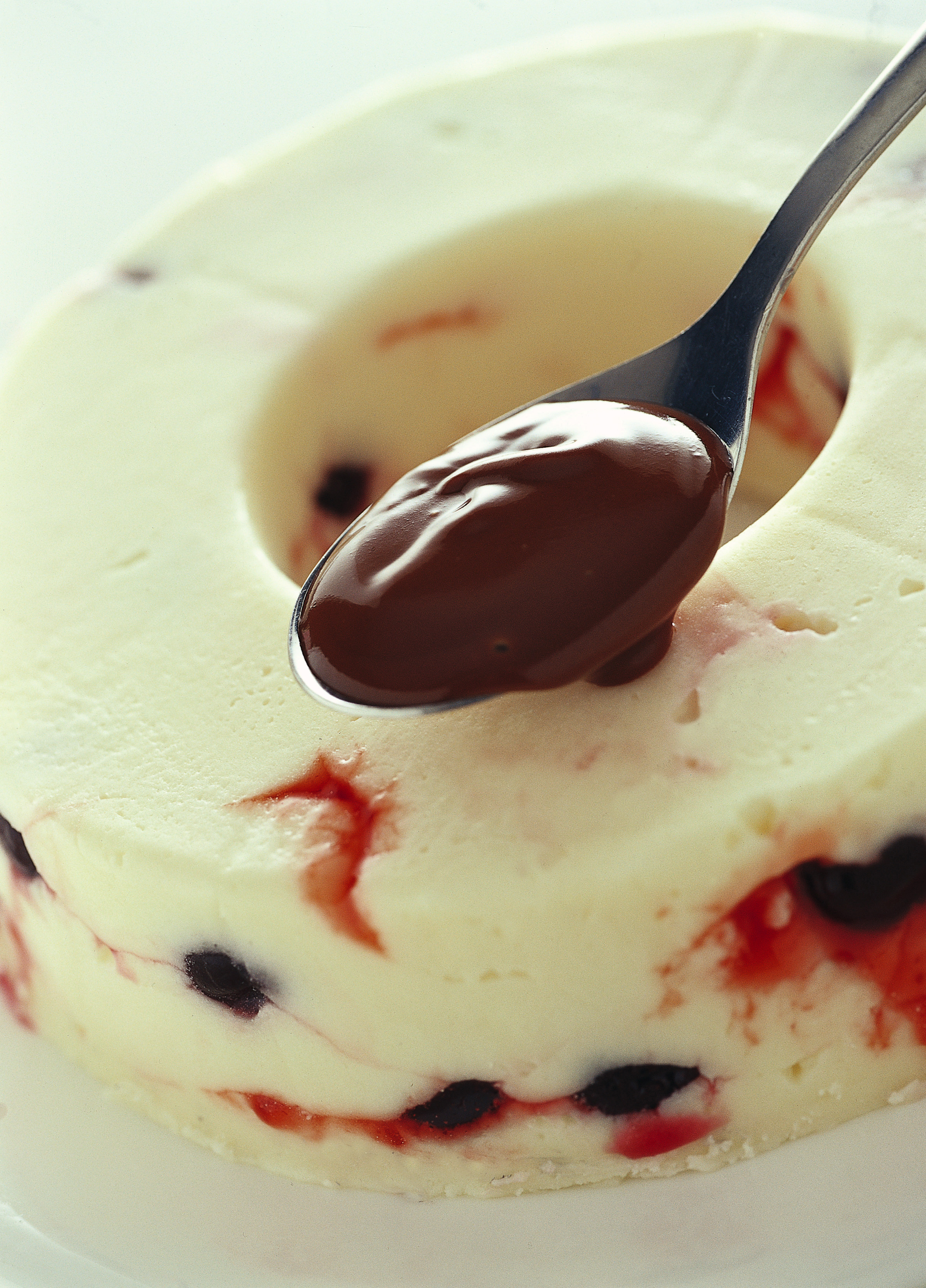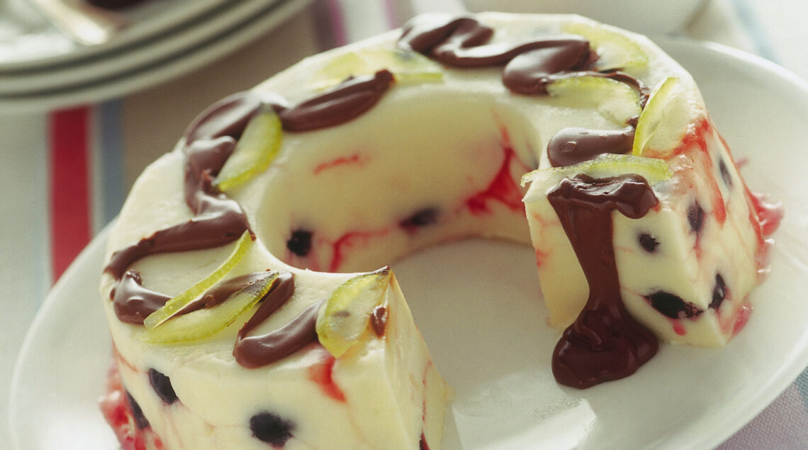 4) Lascia riposare lo stampo in freezer per circa un’ora, sformalo e decoralo secondo il tuo gusto con fettine di cedro candito e fili di salsa. Offri la ciambella agli agrumi con salsa di cioccolato versando il resto della salsa nell’apposita salsiera.