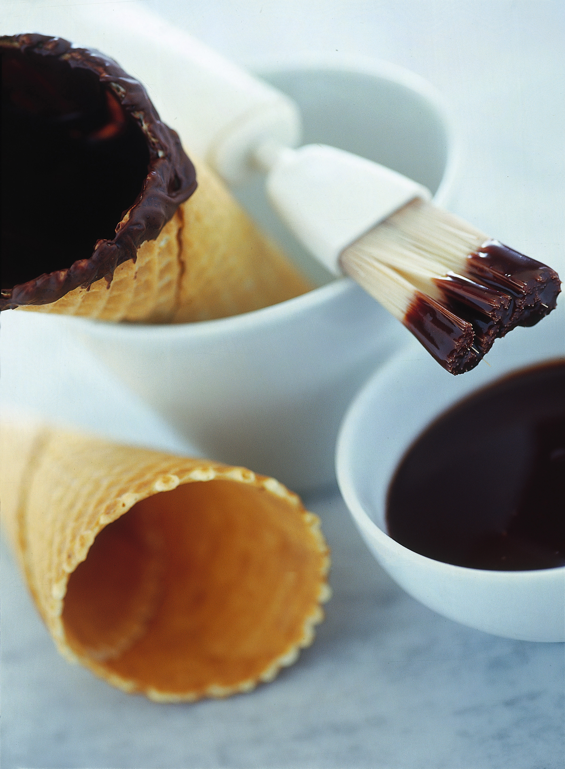 1) Realizza dei deliziosi coni da gustare con il gelato grazie alla ricetta dei coni al caramello: in una casseruola spezzetta il cioccolato e scioglilo a bagnomaria, lascialo intiepidire e poi utilizzalo per ricoprire in maniera uniforme la parte interna dei coni, aiutandoti con un pennello.