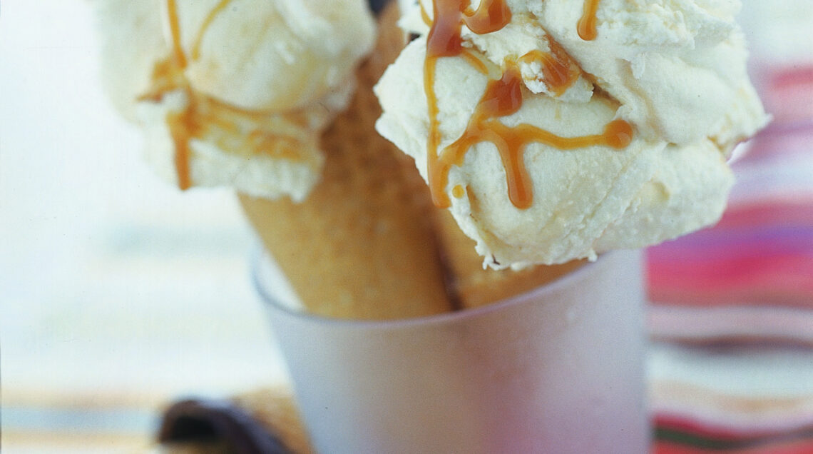 5) Ora puoi riempire i coni al caramello e servirli subito, magari accompagnati da qualche cialda croccante. Se lo desideri, puoi realizzare lo stesso la ricetta con 1 kilo di gelato già pronto.