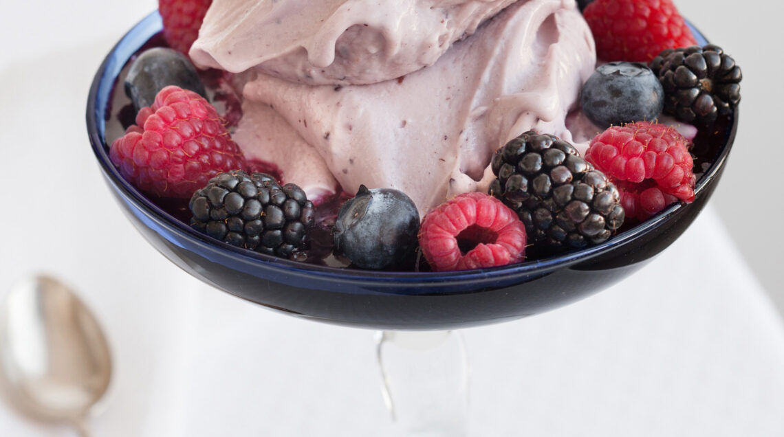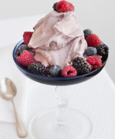 8) Guarnite le coppette disponendo intorno al gelato i frutti di bosco, previsti per il decoro e servite subito il gelato di ricotta ai frutti di bosco.