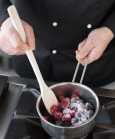 3) Sistemate sul fuoco, aggiungete lo zucchero rimasto e portate a ebollizione, mescolando con un cucchiaio di legno fino a ottenere una salsa ai frutti di bosco.