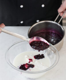 4) Riprendete la ciotola con il mix di latte, panna e zucchero e incorporate a cucchiaiate e poco per volta, la ricotta di pecora. Lavorate e amalgamate il composto base del gelato, delicatemente, con una frusta; continuando a mescolare, aggiungete a cucchiaiate la salsa ai frutti di bosco preparata.