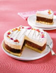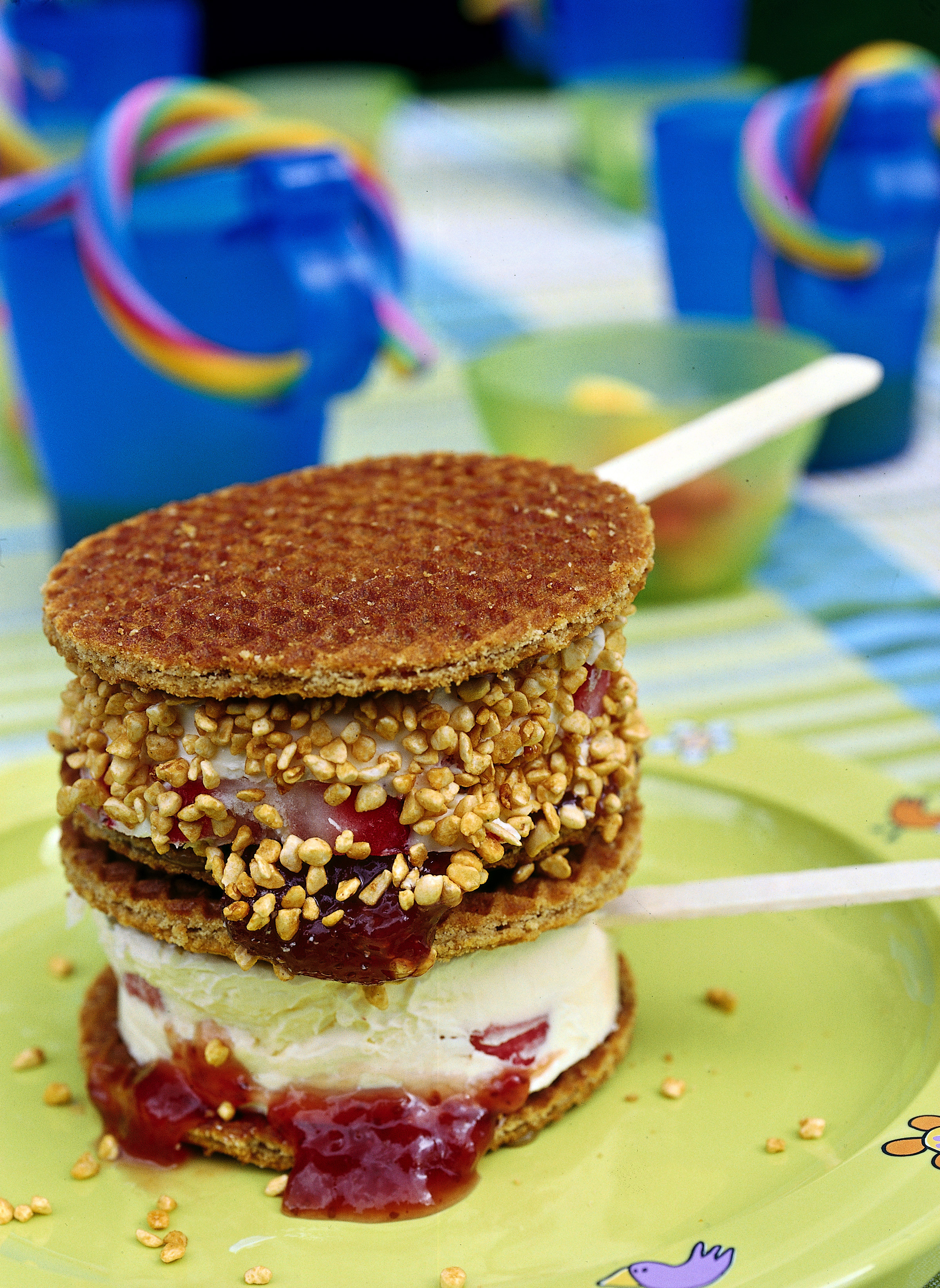 3) Spalma 8 cialdegià pronte o biscotti digestive con la confettura; sforma i gelati, elimina la pellicola e adagiali sulle cialde; coprili con le cialde rimaste, premi leggermente per compattare i sandwich e passali nella granella di nocciole o di noci prima di portarli in tavola.
