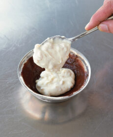 2) Prendi una base di pan di Spagna già pronta e ricavane 4 dischi che abbiano la stessa dimensione degli stampini, bagnali con il rum e adagiali sulla crema.