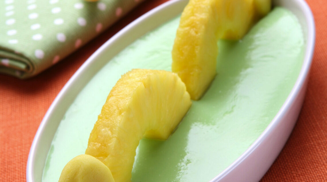 2) Suddividi il budino in 2 pirofile e fai raffreddare in frigo. Quindi taglia a metà 2 fette di ananas sciroppato e immergile, 2 a 2, nelle pirofile.