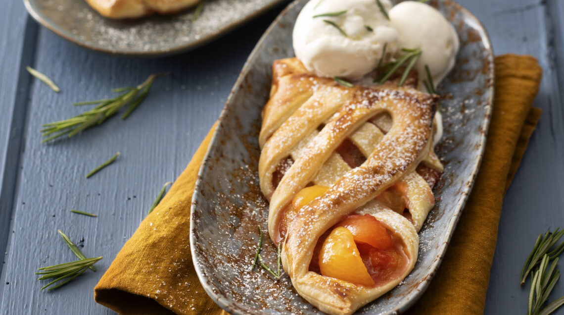 Pasta sfoglia, prugne al burro profumate di rosmarino e gelato ai fiori di lavanda. Una piccola opera d'arte da gustare fino all'ultimo boccone