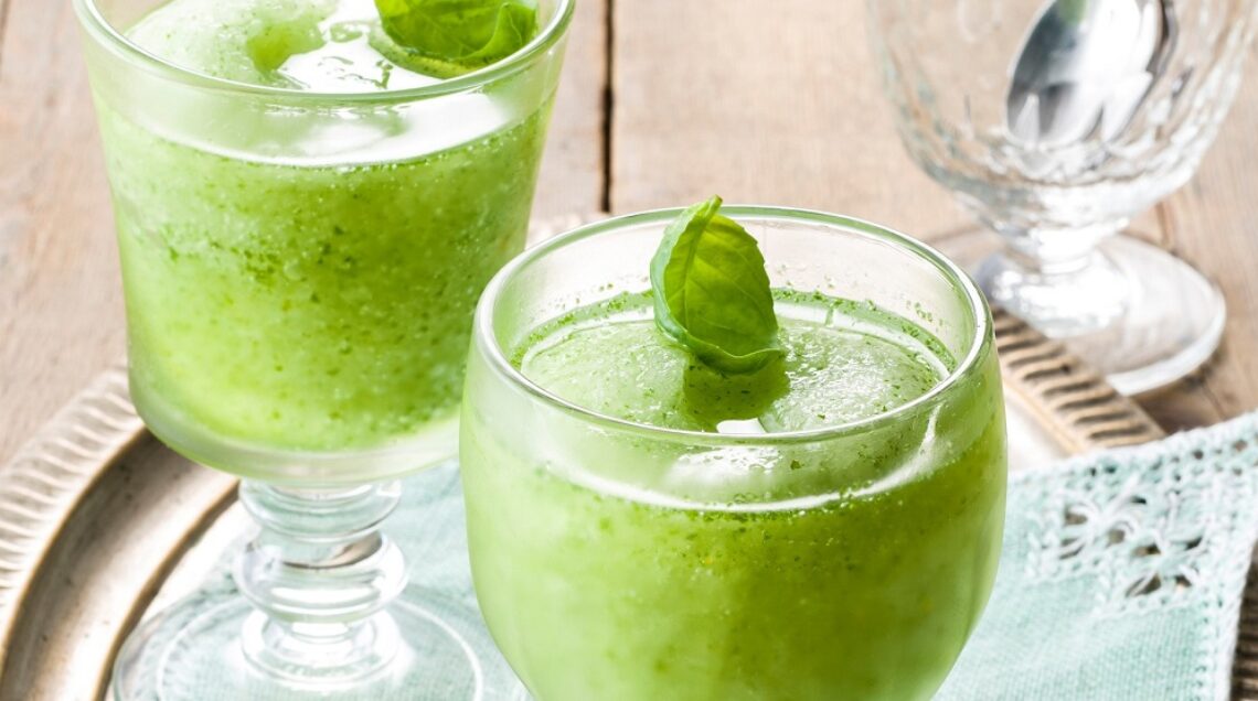 5) Distribuitelo in 4 bicchieri, decorate ognuno con una fogliolina di basilico e servite immediatamente.
