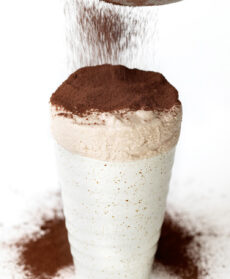 7) Completa e servi. Guarnisci la superficie con una spolverata di cacao amaro e servi subito il tuo soufflé gelato al cioccolato.