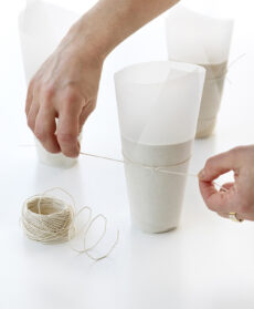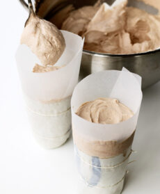 1) Prepara gli stampi. Ritaglia 6 rettangoli di carta da forno abbastanza lunghi da poter avvolgere i bicchieri e alti circa una volta e mezzo; rivesti i bicchieri, legali con 2 giri di spago da cucina e metteli in frigorifero. Tieni in frigorifero anche la panna fino al momento di montarla.
