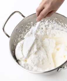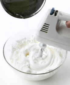 3) Prepara la meringa italiana. Raccogli gli albumi in una ciotola e montali a neve fermissima con le fruste elettriche. Con le fruste sempre in movimento, versa a filo lo sciroppo caldo. Raffredda rapidamente il composto: appoggia la ciotola in una più grande riempita con cubetti di ghiaccio e sale, e lavora energicamente la meringa, a bagnomaria, finché si sarà raffreddata; copri la ciotola con un foglio di pellicola e mettila in frigo.