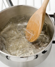 2) In un’altra casseruola sciogli 12 grammi di gelatina dopo averla ammorbidita in acqua fredda e strizzata in 3-4 cucchiai di Moscato. Uniscila al resto del composto che sta intiepidendo e poi mettila a raffreddare in frigorifero.