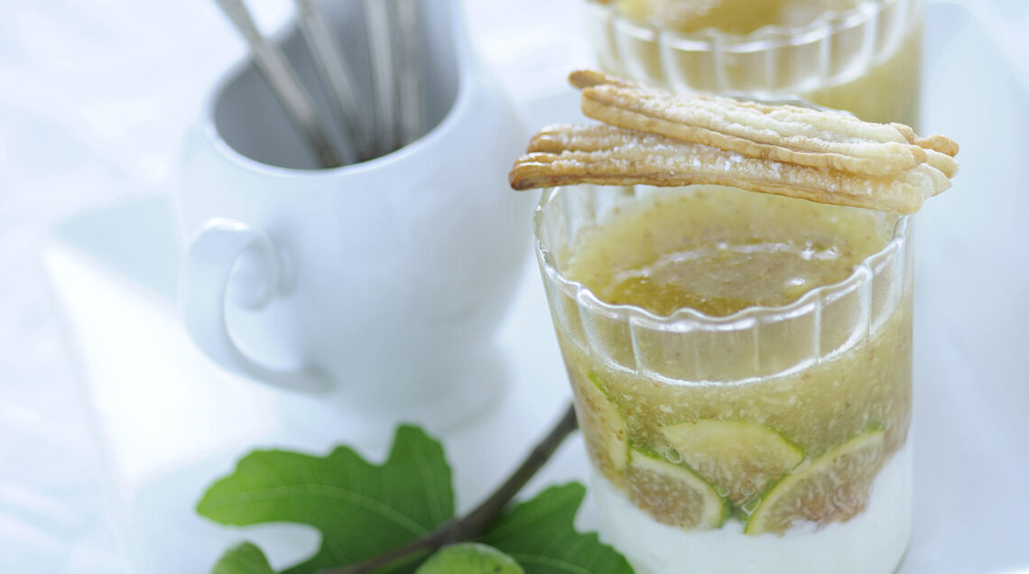 3) Monta la ricotta con la scorza del limone grattugiata e il miele rimasto. Distribuiscila sul fondo di 4 bicchieri, distribuisci sulle pareti i fichi a fettine, e versa il composto di fichi e miele preparato.