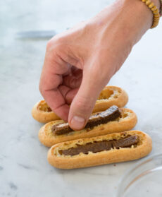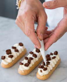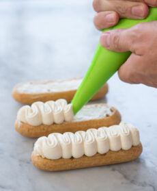 Farcite gli éclair con la ganache al caffè. Montate 110 g di mascarpone con 160 g di panna fresca, 20 g di zucchero semolato e 10 g di zucchero a velo e profumate con 3 g di sciroppo alla vaniglia. Ricoprite gli éclair con la crema al mascarpone fatta scendere "a onde" da un sac à poche.
