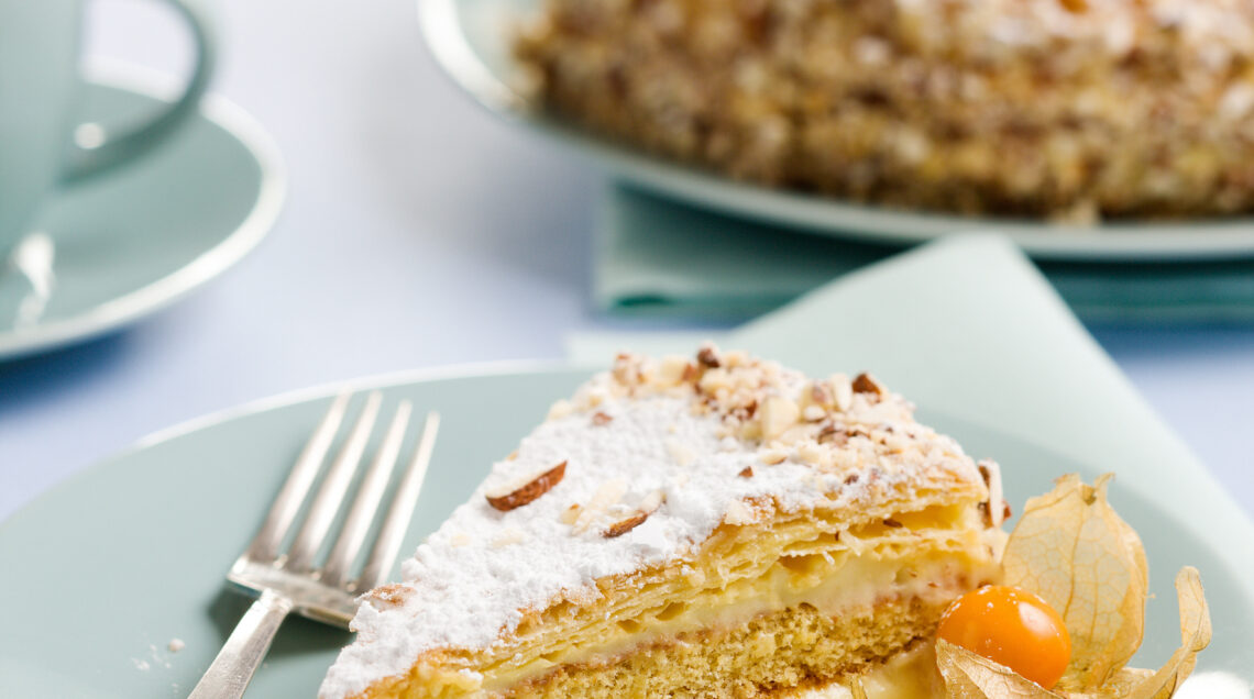 4) Pareggiate i bordi dei dischi di sfoglia, sistematene uno su un tagliere e stendetevi un terzo della crema; appoggiatevi il disco di pan di Spagna spruzzato con un po' di liquore e spalmatelo con un altro terzo di crema; terminate con il secondo disco di sfoglia.