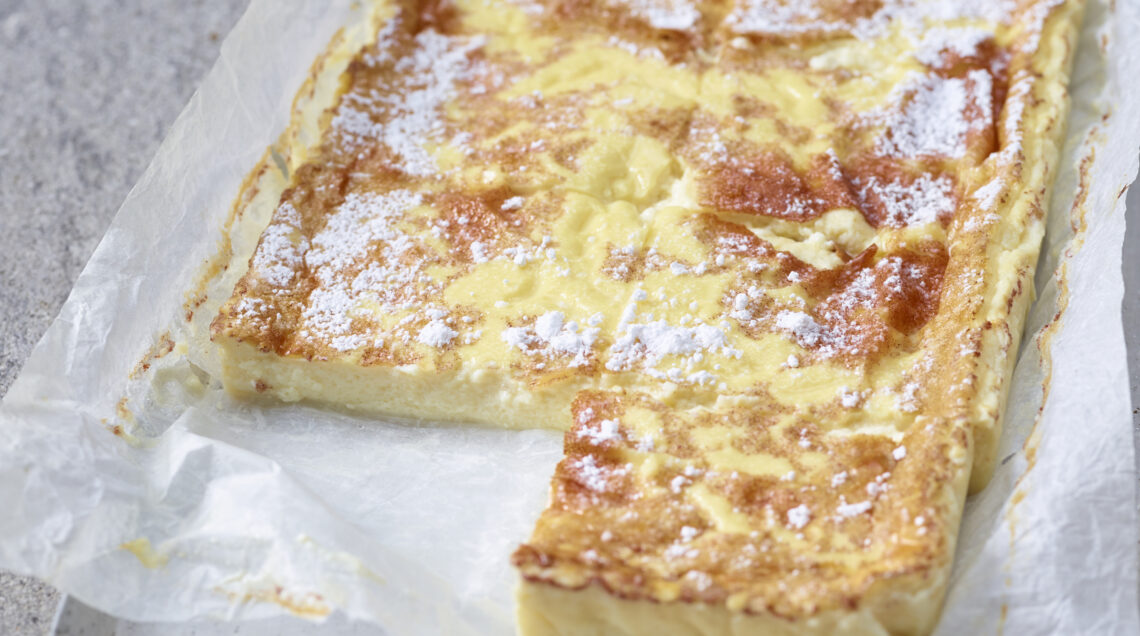 3 Trasferite la pastella ottenuta in una teglia di 20x26 cm, rivestita con carta da forno, e cuocete nel forno già caldo a 160° per 1 ora. Lasciate raffreddare la crema, quindi ponetela in frigorifero per 1 ora. Cospargetela con lo zucchero a velo, levatela dalla teglia e servitela a rettangoli.