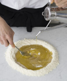 Stendete la pasta, posatevi sopra una teglia (28 cm), rifilate con una rotella e trasferite in una teglia (26 cm) unta d'olio e infarinata. Infornate per 20 minuti a 170°. Fate raffreddare e sformate.
