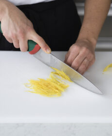 Per le scorze confit, ricavate la buccia gialla degli agrumi e tagliatela a listarelle sottili. Mettetele in un pentolino con acqua fredda, portate a ebollizione e scolate. Ripetete l'operazione altre 2 volte, sempre partendo da acqua fredda. Preparate uno sciroppo con lo zucchero e 0,5 dl di acqua. Unite le scorze e cuocete a fuoco molto basso per 10 minuti.