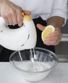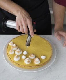 Con una tasca da pasticceria formate tanti spumoncini sulla torta e fiammeggiateli con il cannello. Decorate con le scorzette di limone sgocciolate.
