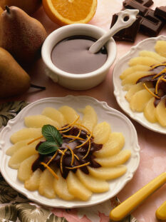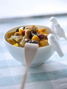 Macedonia estiva con albicocche, pesche, fichi e crumble di mandorle