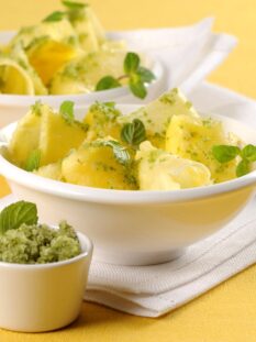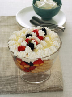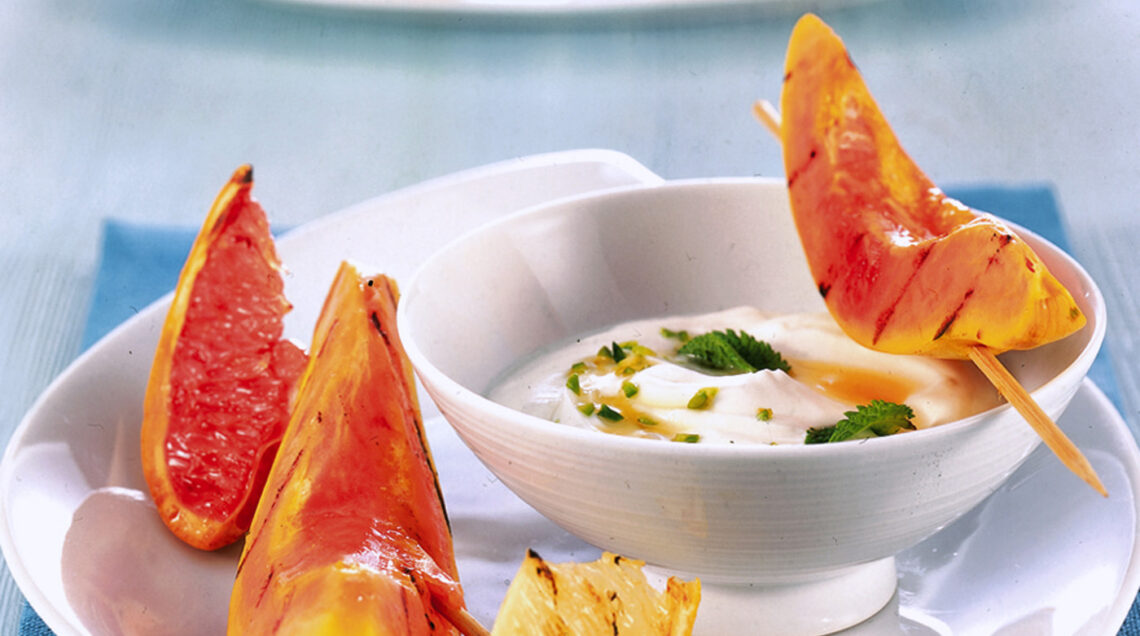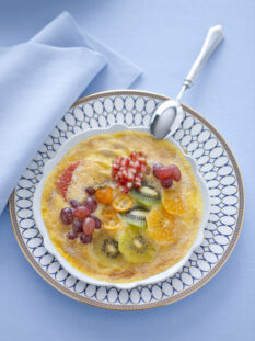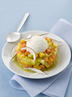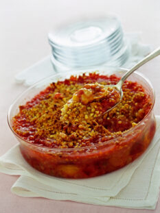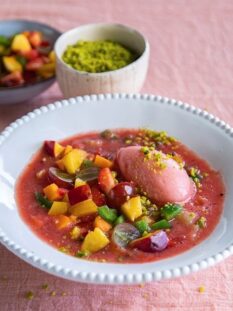 Macedonia estiva con albicocche, pesche, fichi e crumble di mandorle