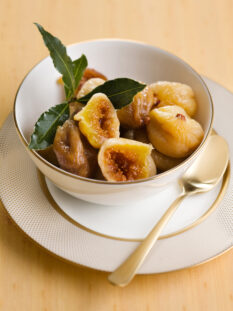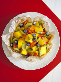Macedonia estiva con albicocche, pesche, fichi e crumble di mandorle