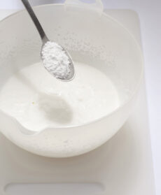 Lavorate la panna con le fruste elettriche, aggiungendo lo zucchero a velo quando è quasi montata. Se lo aggiungeste quando ormai è già montata, rischiereste di trasformarla in burro.