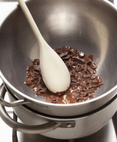Tritate il cioccolato, mettetelo in un polsonetto (recipiente in metallo a fondo bombato per la cottura a bagnomaria) e appoggiatelo su una pentola con acqua in leggera ebollizione. Quando il cioccolato inizia a fondere, mescolatelo finché è sciolto. Trasferite il polsonetto sul piano di lavoro.