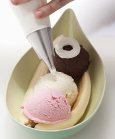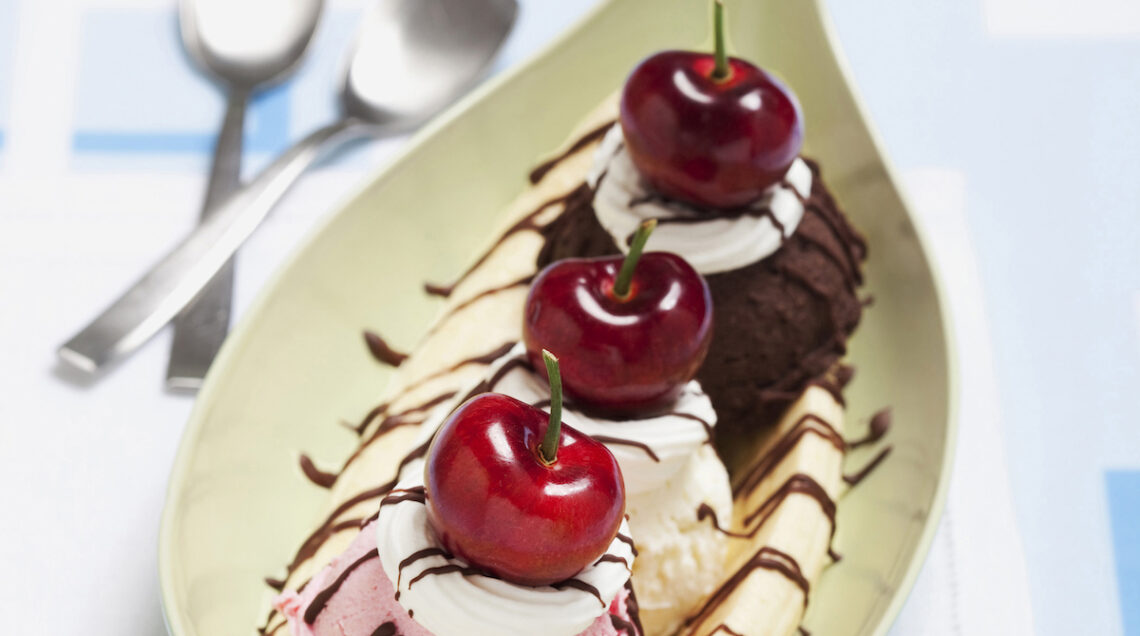 Sbucciate le banane, dividetele a metà nel senso della lunghezza, bagnatele con il succo del limone e appoggiatene due su un piattino lungo, lasciando spazio in mezzo. Disponete al centro una pallina di gelato per ogni gusto. Su ognuna formate un anello di panna montata fatta scendere da una tasca da pasticciere e completate con una ciliegia. Decorate con cioccolato fondente fuso.